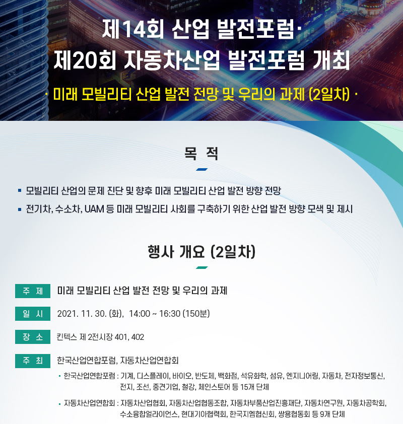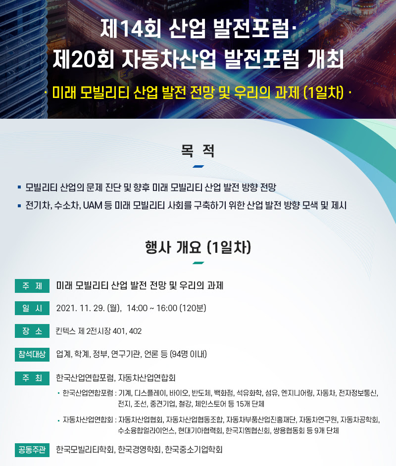 한국산업연합포럼과 자동차산업연합회는 2021년 11월 29일~30일 2일간 「제14회 산업발전포럼 · 제20회 자동차산업발전포럼」을 개최하였다(한국모빌리티학회, 한국경영학회, 한국중소기업학회 공동주관). 본 포럼은 '미래 모빌리티 산업 발전 전망 및 우리의 과제'라는 주제로 킨텍스 제2전시장에서 성황리에 개최되었으며, 온라인으로도 생중계되었다.
