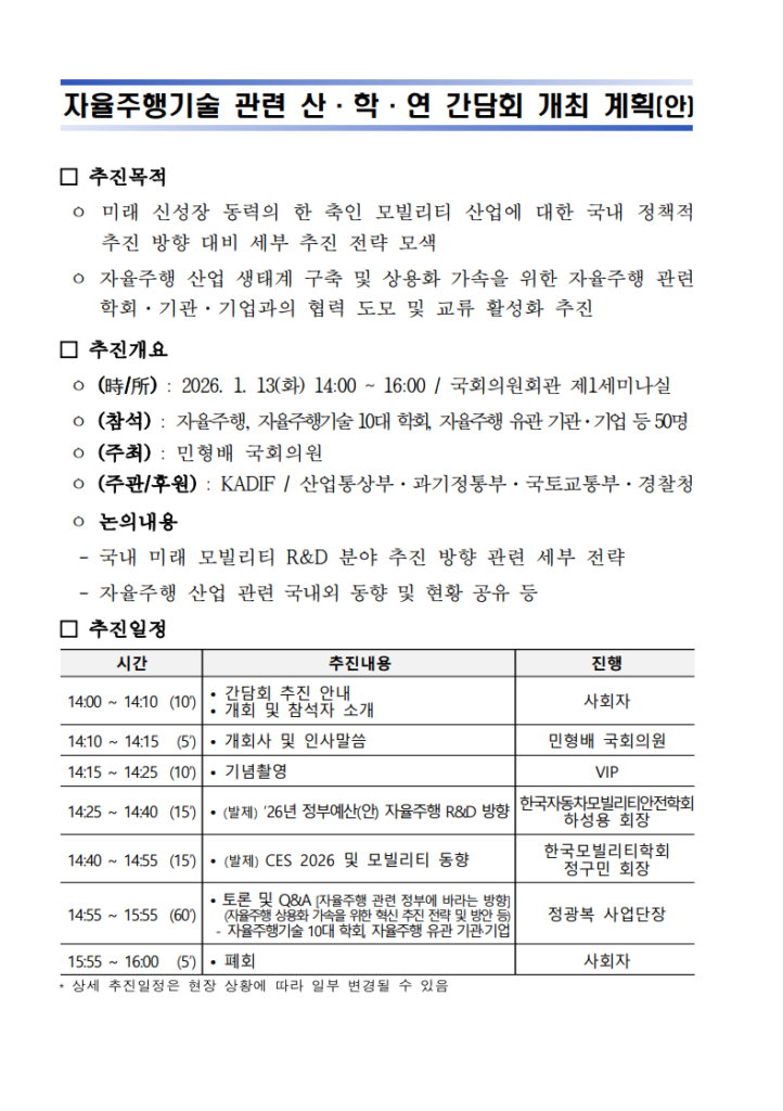 - 일시/장소 : 2026.1.13.(화) 14:00~16:00 / 국회의원회관 제1세미나실